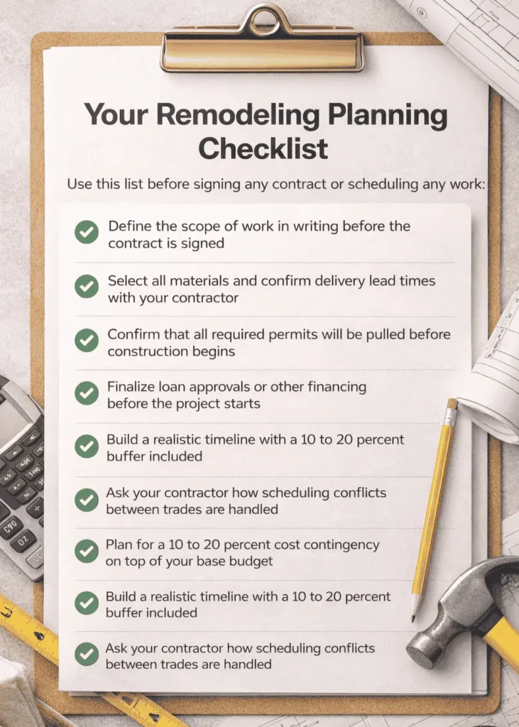 Delays in home remodeling are common, but most are not inevitable. Permits pulled on time, materials ordered early, selections finalized before work begins, and financing secured in advance are the four habits that separate smooth projects from stressful ones.